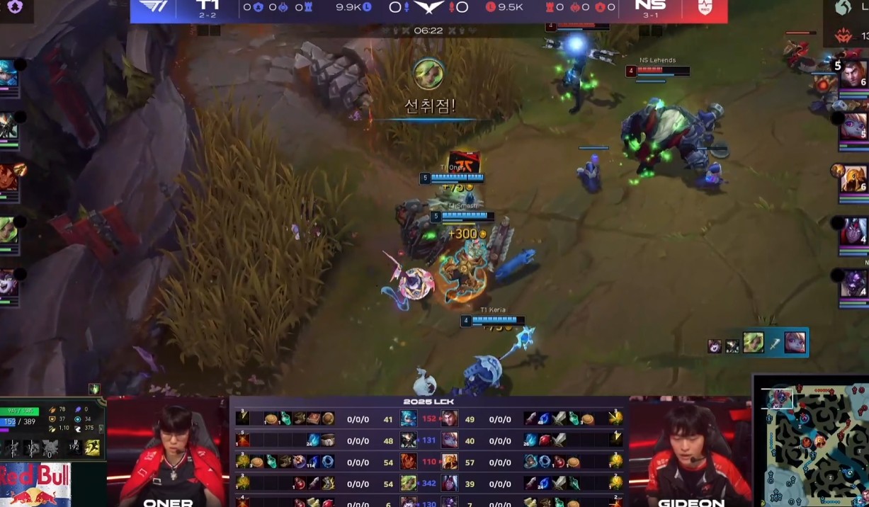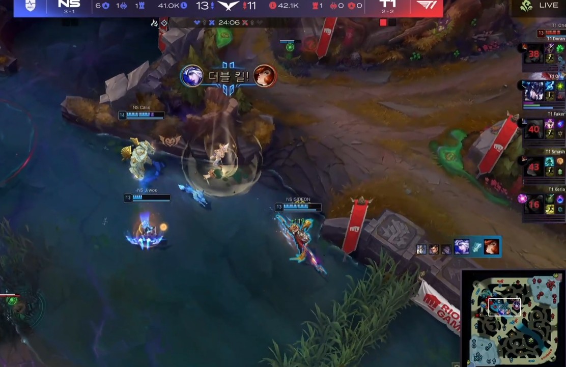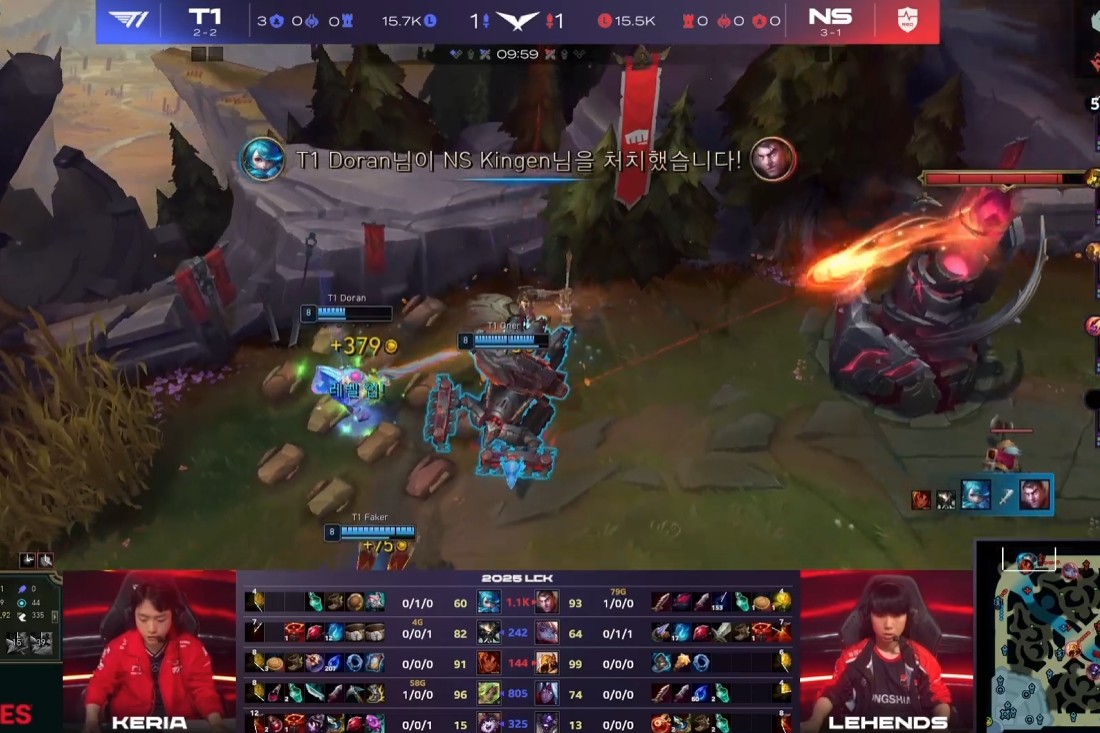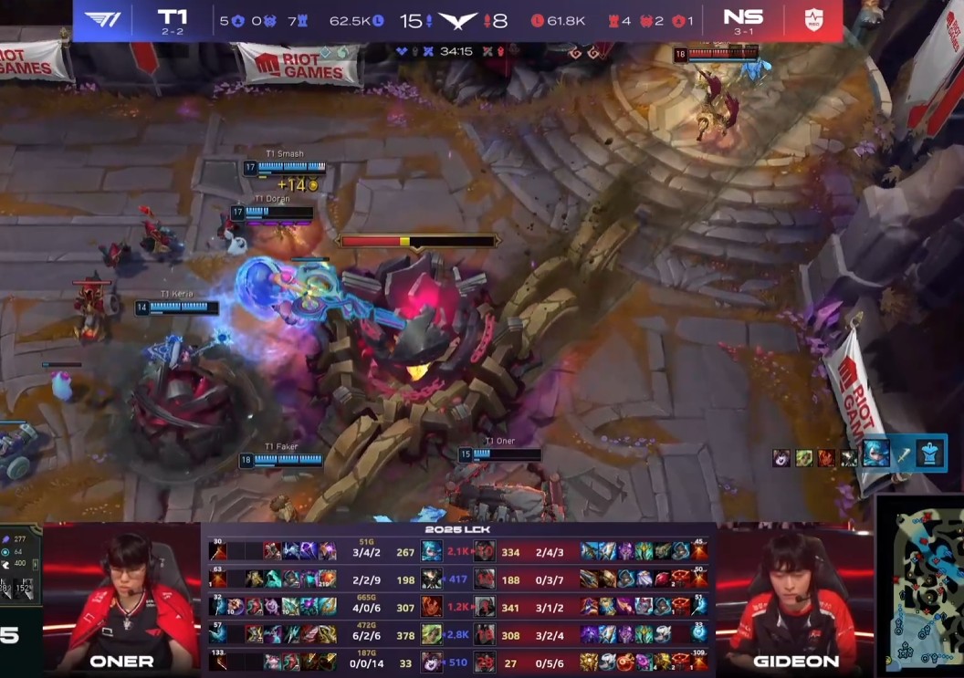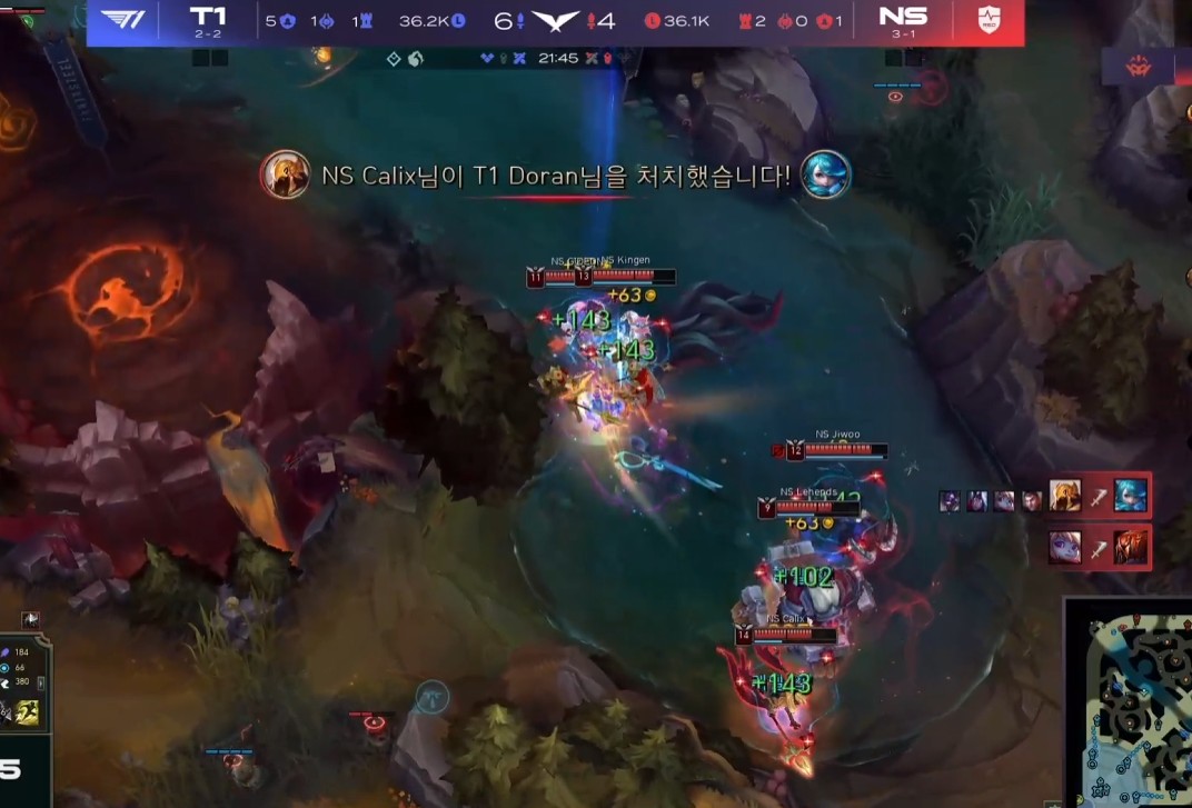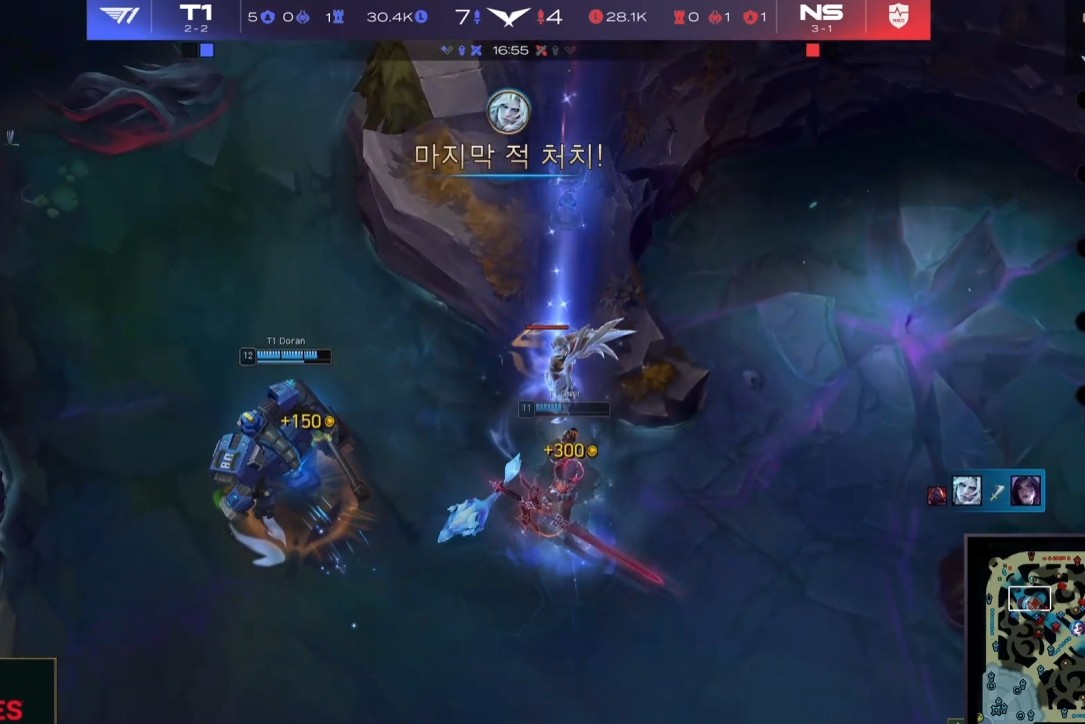 - 유충전 노플인 케리아 선수를 노린 농심의 노림수를 오너선수의 스카너가 적절한 커버로 제리에게 킬을 먹이면서 시작하는 티원.