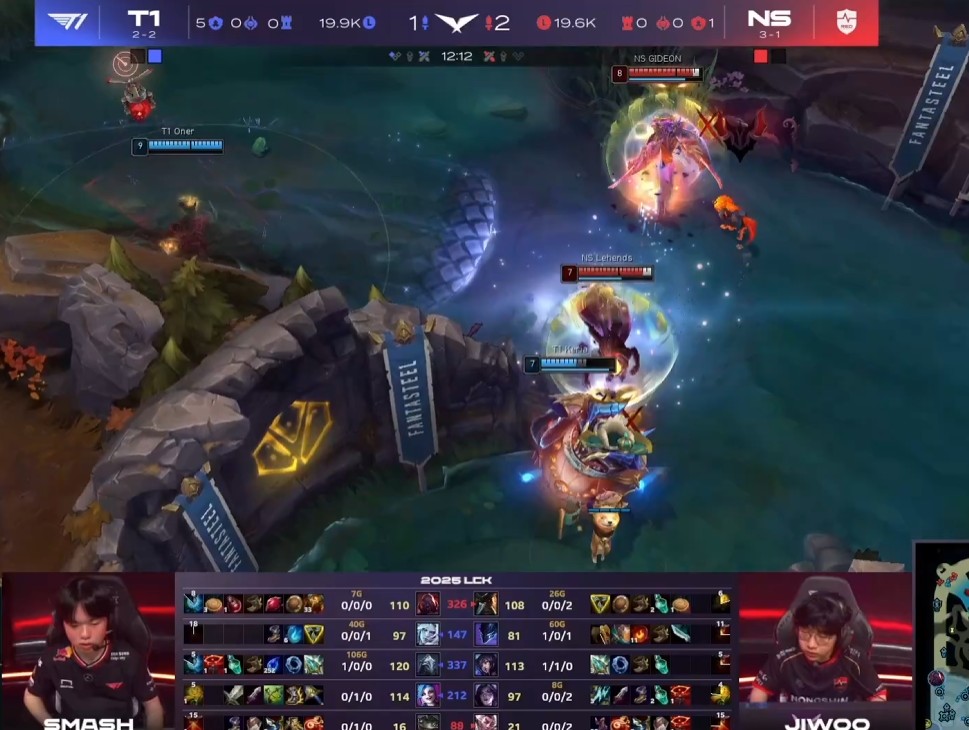 - 그 후에도 계속된 노림수로 상대를 노려봤지만 탐켄치의 세이브와 오히려 역으로 상대에게 킬을 내주는 모습을 보이며 T1의 조합은 힘이 빨리 올라오며 자연스럽게 농심조합의 힘이 빠지게 됩니다.