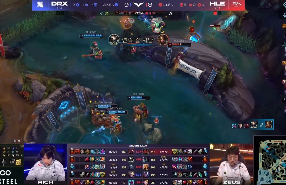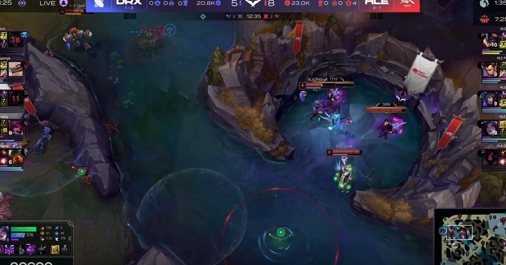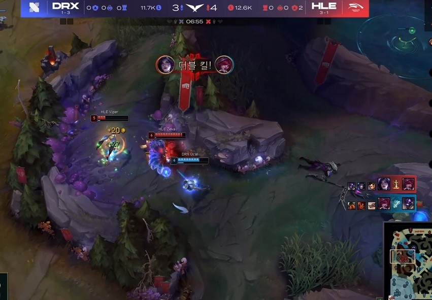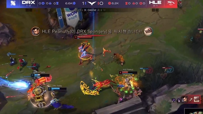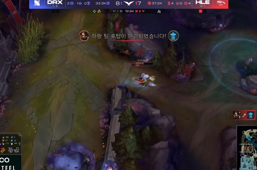- DRX의 딜러진들도 킬을 잘 먹으며 좋은 성장세를 보였는데요, 그렇지만 니달리에게 사이드를 휘둘리며 2차 포탑을 모두 내주게 됩니다. 사이온 혼자선 못 막고 빅토르가 오거나 최소 2명이 와야 하는 상황인데, 그렇게 되면 본대의 강제력이 어느 정도 있는 HLE의 조합이기 때문에 사이드를 억제하는 게 까다로웠습니다.