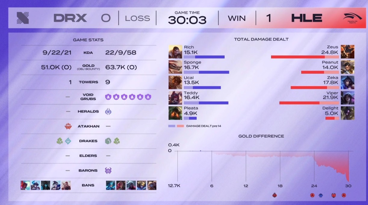 - 실제로 사이드에서 니달리는 잡아 냈지만 오히려 본대 쪽에서 덜미를 잡히며 그대로 게임이 마무리됩니다. 마지막 순간까지 너무 아쉬운 상황의 DRX, 그리고 그런 상황에서 상대의 빈틈을 잘 캐치한 한화의 좋은 플레이, 팀 간의 격차를 보여주는 매치였다고 생각합니다. 거기에 피넛선수가 매치 500승을 정글러 최초로 기록합니다. 축하합니다.