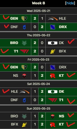 | 2025 LCK 8주차 경기 일정 및 승부 예측 (2) | 2025.05.20 |