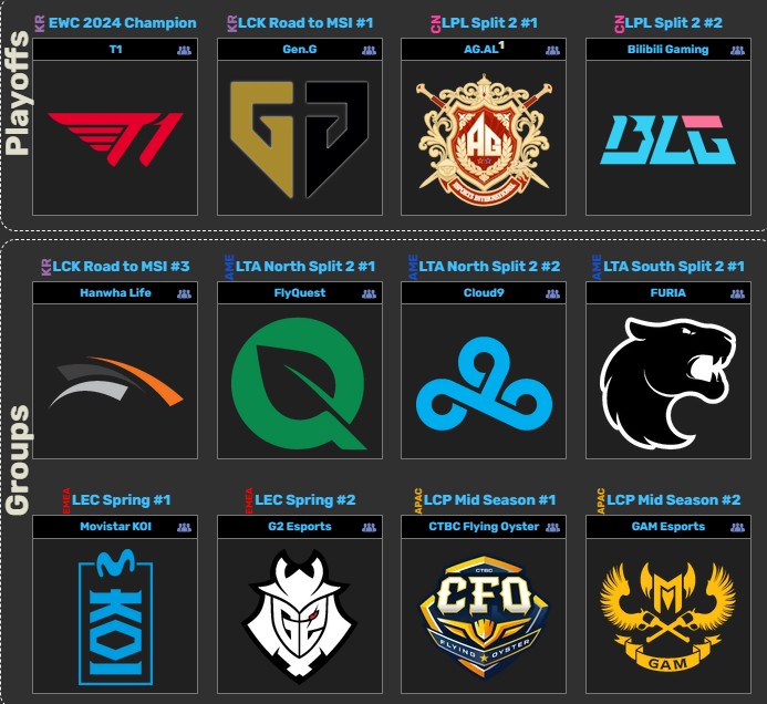 대회는 그룹 스테이지와 녹아웃스테이지로 이뤄지고 젠지, T1, AL, BLG 등 MSI 4강 팀들이 녹아웃스테이지에 자동진출됐습니다.